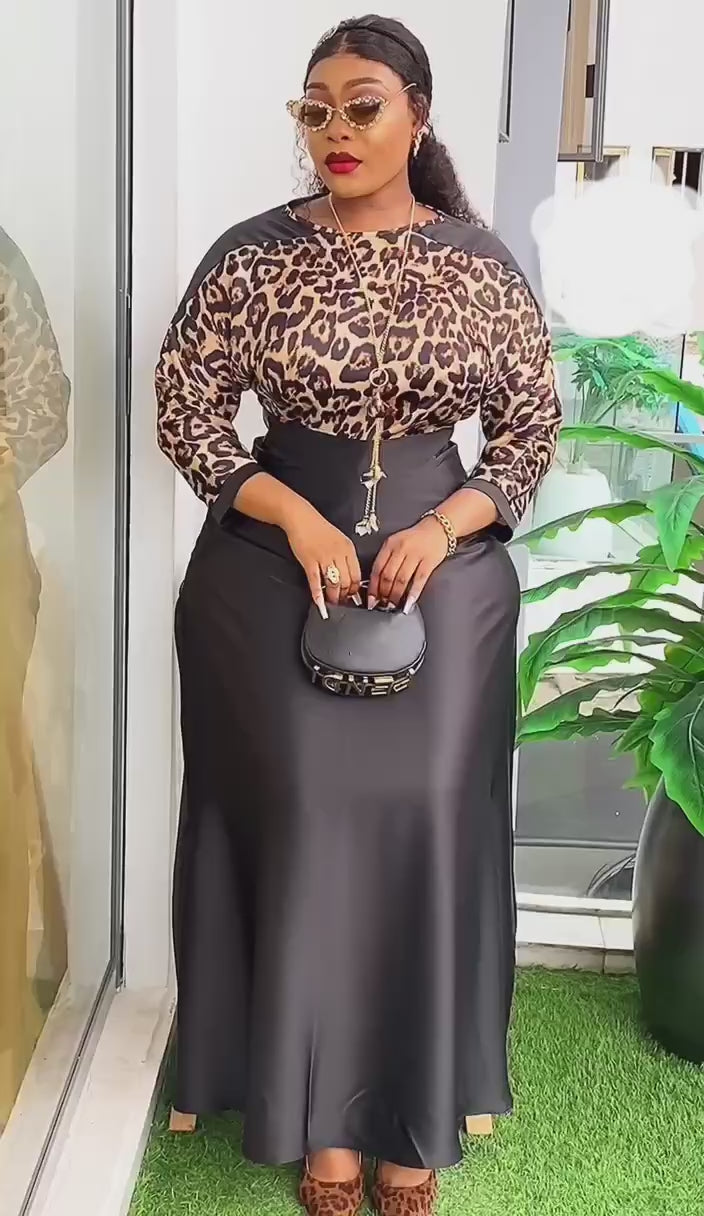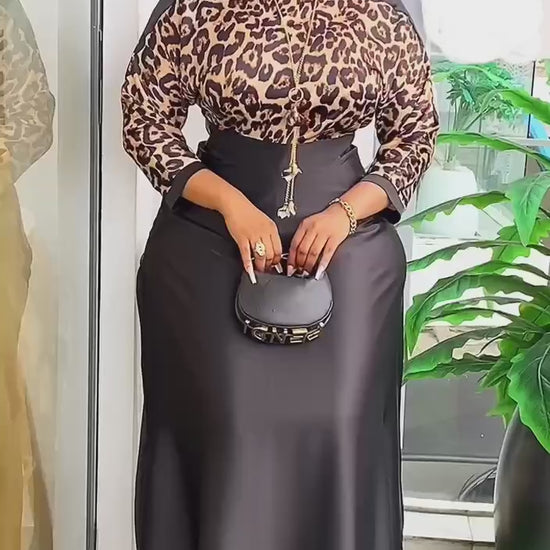 Jupe longue évasée noir en tissus satin avec blouse à motif léopard